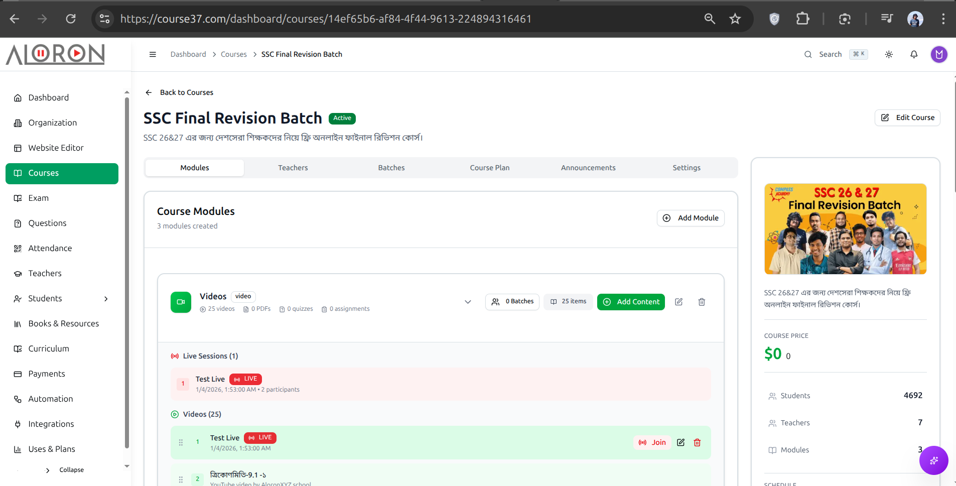 Stop juggling separate tools for your website, videos, and payments. Course37 unifies everything—live classes, course management, AI assistance, exams, and automation—into one simple dashboard for educators and coaching centers.