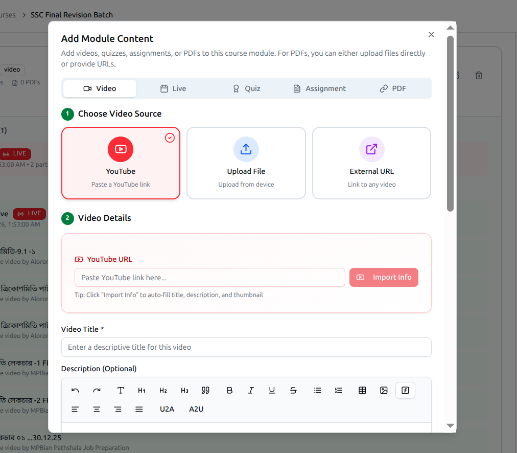 Your course videos are hosted on one platform, your live classes happen on another, and your student payments come through a third. You're pasting assignment links in chat groups, manually tracking attendance in spreadsheets, and spending weekends grading papers. Your students are jumping between websites, apps, and social media just to learn from you.
