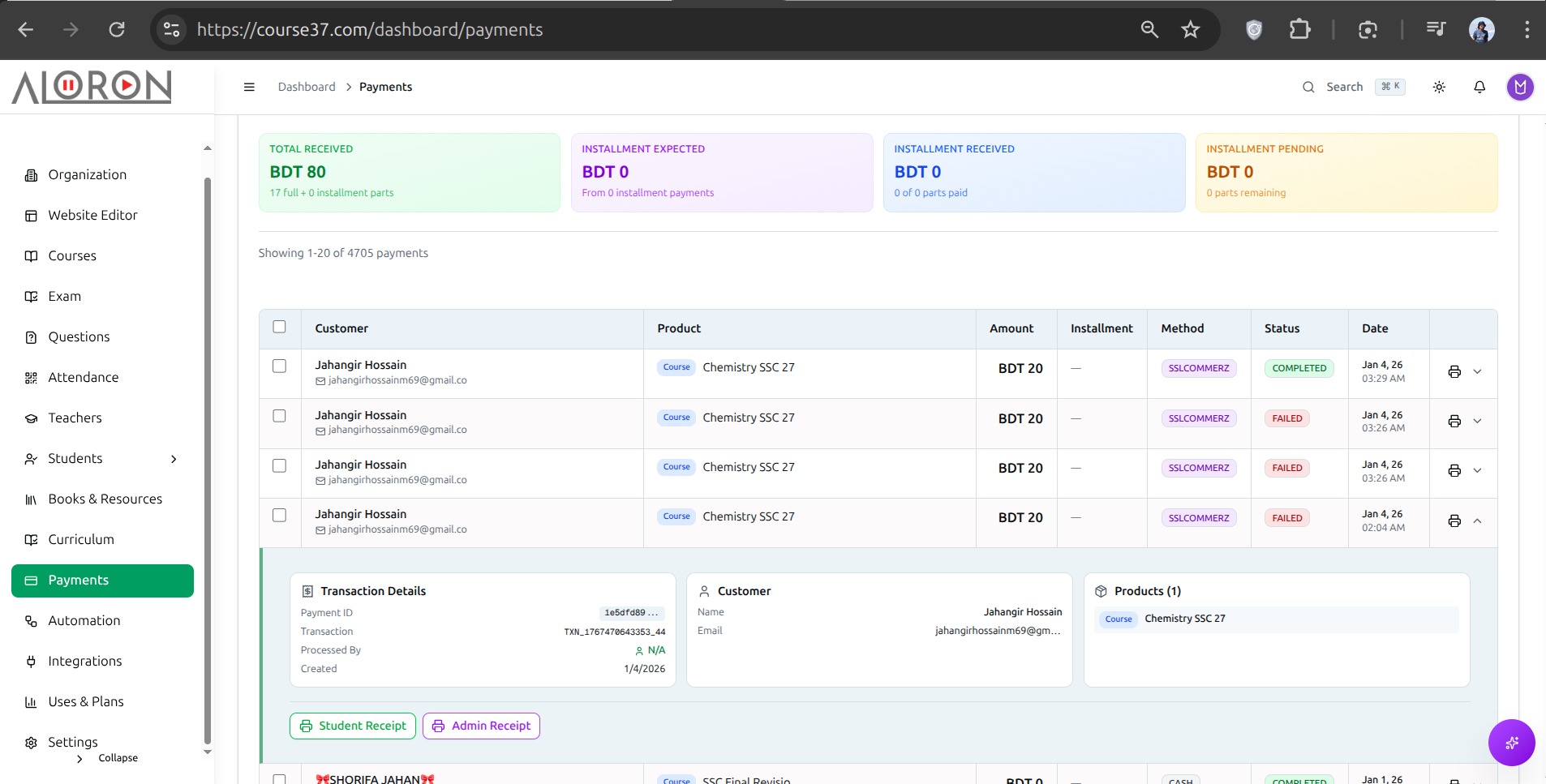 Create structured courses with support for multiple branches and batches, perfect for coaching centers. Manage installment-based payments, generate student ID cards and payment receipts automatically, and track everything with advanced analytics. Granular, role-based access ensures teachers, moderators, and staff have the right permissions.